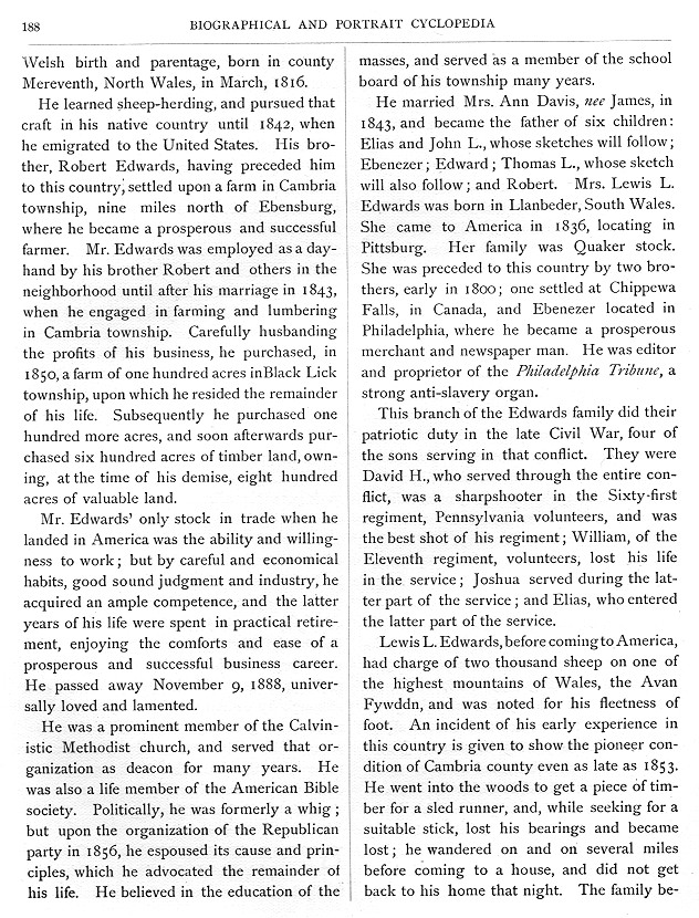 Welsh birth and parentage, born in county Mereveath, North Wales, in March, 1816. He learned sheep-herding and pursued that craft in his native country until 1842, when he emigrated to the United States. His brother, Robert Edwards, having preceded him to this country; settled upon a farm in Cambria township, nine miles north of Ebensburg, where he became a prosperous and successful farmer. Mr. Edwards was employed as a day-hand by his brother Robert and others in the neighborhood until after his marriage in 1843, when he engaged in farming and lumbering in Cambria township. Carefully husbanding the profits of his business, he purchased, in 1850, a farm of one hundred acres in Black Lick township, upon which he resided the remainder of his life. Subsequently he purchased one hundred more acres, and soon afterwards purchased six hundred acres of timber land, owning, at the time of his demise, eight hundred acres of valuable land. Mr. Edwards' only stock in trade when he landed in America was ability and willingness to work; but by careful and economical habits, good sound judgment and industry, he acquired an ample competence, and the latter years of his life were spent in practical retirement, enjoying the comforts and ease of a prosperous and successful business career. He passed away November 9, 1888, universally loved and lamented. He was a prominent member of the Calvinistic Methodist church, and served that organization as deacon for many years. He was also a life member of the American Bible society. Politically, he was formerly a whig; but upon the organization of the Republican party in 1856, he espoused its cause and principles, which he advocated the remainder of his life. He believed in the education of the |