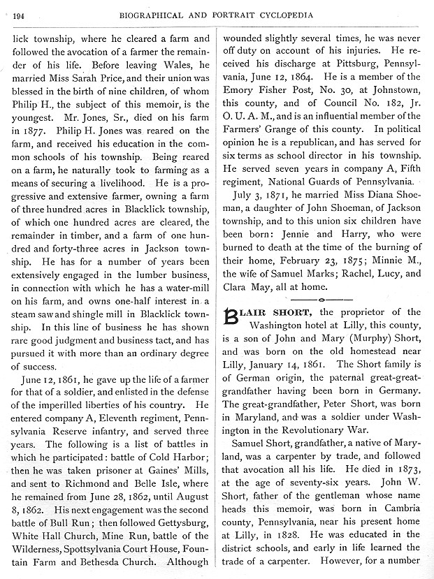 lick township, where he cleared a farm and followed the avocation of a farmer the remainder of his life. Before leaving Wales, he married Miss Sarah Price, and their union was blessed in the birth of nine children, of whom Philip H., the subject of his memoir, is the youngest. Mr. Jones, Sr., died on his farm in 1877. Philip H. Jones was reared on the farm, and received his education in the common schools of his township. Being reared on a farm, he naturally took to farming as a means of securing a livelihood. He is a progressive and extensive farmer, owning a farm of three hundred acres in Blacklick township, of which one hundred acres are cleared, the remainder in timber, and a farm of one hundred and forty-three acres in Jackson township. He has for a number of years been extensively engaged in the lumber business, in connection with which he has a water-mill on his farm, and owns one half interest in a steam saw and shingle mill in Blacklick townshp. In this line of business he has shown rare good judgment and business tact, and has pursured it with more than an ordinary degree of success. June 12, 1861, he gave up the life of a farmer for that of a soldier, and enlisted in the defense of the imperilled liberties of his country. He entered company A, Eleventh regiment, Pennsylvania Reserve infantry, and served three years. The following is a list of battles in which he participated: battle of Cold Harbor; then he was taken prisoner at Gaines' Mills, and sent to Richmond and Belle Isle, where he remained from June 28, 1862, until August 8, 1862. His next engagement was the second battle of Bull Run; then followed Gettysburg, White Hall Church, Mine Run, battle of the Wilderness, Spottsylvania Court House, Fountain Farm and Bethesda Church. Although |