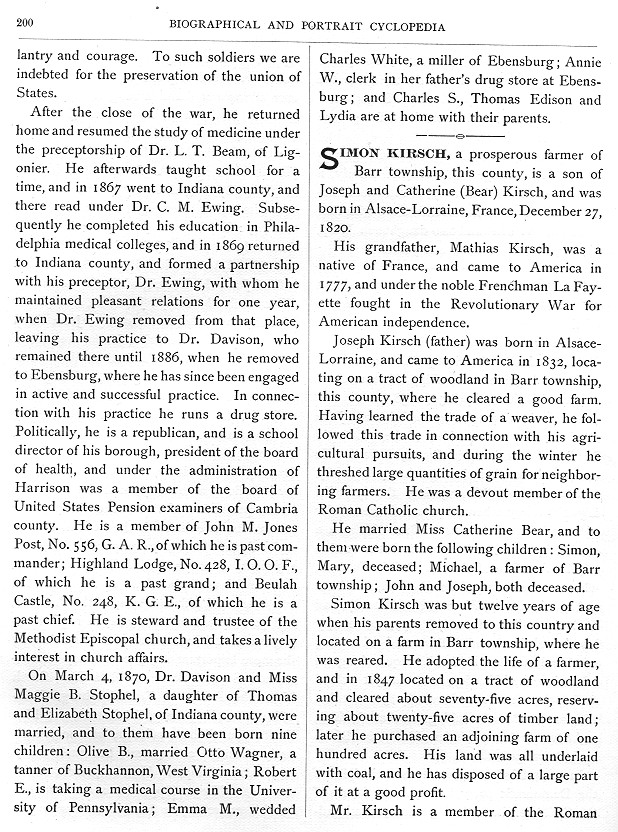 SIMON KIRSCH, a prosperous farmer of Barr township, this county, is a son of Joseph and Catherine (Bear) Kirsch, and was born in Alsace-Lorraine, France, December 27, 1820. |