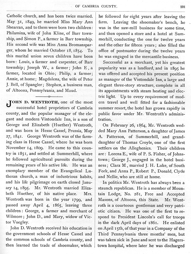he followed for eight years after leaving the farm. Leaving the shoemaker's bench he was in the saw-mill business for some time, and then opened a store and a hotel at Summerhill, conducting the one for twelve years and the other for fifteen years; also filled the office of postmaster during the twelve years he was engaged in the mercantile business. Successful as a merchant, yet his greatest popularity was as a landlord, and in 1895, he was offered and accepted his present position as manager of the Vintondale Inn, a large and elegant three-story structure, complete in all its appointments with steam heating and electric light. Up to every requirement of modern travel and well fitted for a fashionable summer resort, the hotel has grown rapidly in public favor under Mr. Wentroth's administration. On February 26, 1864, Mr. Wentroth wedded Mary Ann Patterson, a daughter of James A. Patterson, of Summerhill, and grand-daughter of Thomas Croyle, one of the first settlers on the Alleghenies. Their children are: Lorena E., wife of P. S. Fisher, or Johnstown; George J., engaged in the hotel business; Clara M., married J. H. Luke, of South Fork, and Anna P., Robert P., Donald, Clyde and Nellie, who are still at home. In politics Mr. Wentroth has always been a staunch republican. He is a member of Mountain Lodge, No. 281, Free and Accepted Masons, of Altoona, this State. Mr. Wentroth is a courteous gentleman and very patriotic citizen. He was one of the first to respond to President Lincoln's call for troops in the dark April days of 1861. He enlisted on April 15th, of that year in a Company of the Third Pennsylvania three months' men, but was taken sick in June and sent to the Hagerstown hospital, where later he was discharged |