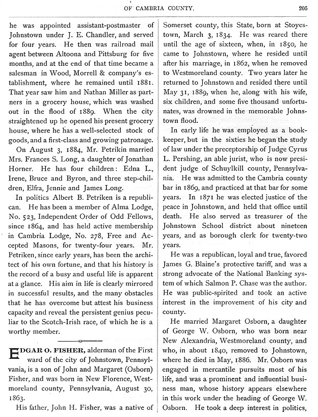 he was appointed assistant-postmaster of Johnstown under J. E. Chandler, and served for four years. He then was railroad mail agent between Altoona and Pittsburg for five months, and at the end of that time became a salesman in Wood, Morrell & company's establishment, where he remained until 1881. That year saw him and Nathan Miller as partners in a grocery house, which was washed out in the flood of 1889. When the city straightened up he opened his present grocery house, where he has a well-selected stock of goods, and a first-class and growing patronage. On August 3, 1884, Mr. Petrikin married Mrs. Frances S. Long, a daughter of Jonathan Horner. He has four children: Edna L., Irene, Bruce and Byron and three step-children, Elfra, Jennie and James Long. In politics Albert B. Petriken is a republican. He has been a member of Alma Lodge, No. 523, Independent Order of Odd Fellows, since 1864, and has held active membership in Cambria Lodge, No. 278, Free and Accepted Masons, for twenty-four years. Mr. Petriken, since early years, has been the architect of his own fortune, and that his history is the record of a busy and useful life is apparent at a glance. His aim in life is clearly mirrored in successful results, and the many obstacles that he has overcome but attest his business capacity and reveal the persistent genius peculiar to the Scotch-Irish race, of which he is a worthy member.