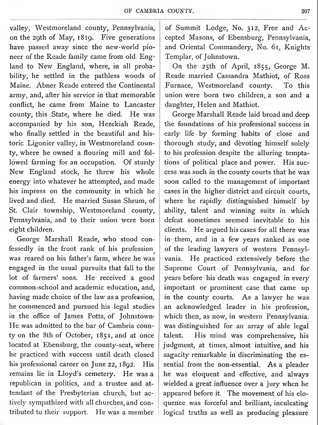 valley, Westmoreland county, Pennsylvania on the 29th of May, 1819. Five generations have passed away since the new-world pioneer of the Reade family came from old England to New England, where in all probability, he settled in the pathless woods of Maine. Abner Reade entered the Continental army, and, after his service in that memorable conflict, he came from Maine to Lancaster county, this State, where he died. He was accompanied by his son, Hezekiah Reade, who finally settled in the beautiful and historic Ligonier valley, in Westmoreland county, where he owned a flouring mill and followed farming for an occupation. Of sturdy New England stock, he threw his whole energy into whatever he attempted, and made his impress on the community in which he lived and died. He married Susan Shrum, of St. Clair township, Westmoreland county, Pennsylvania, and to their union were born eight children. George Marshall Reade, who stood confessedly in the front rank of his profession, was reared on his father's farm, where he was engaged in the usual pursuits that fall to the lot of farmers' sons. He received a good common-school and academic education, and, having made choice of the law as a profession, he commenced and pursued his legal studies in the office of James Potts, of Johnstown. He was admitted to the bar of Cambria county on the 8th of October, 1851, and at once located at Ebensburg, the county-seat, where he practiced with success until death closed his professional career on June 22, 1892. His remains lie in Lloyd's cemetery. He was a republican in politics, and a trustee and attendant of the Presbyterian church, but actively sympathized with all churches, and contributed to their support. He was a member of |