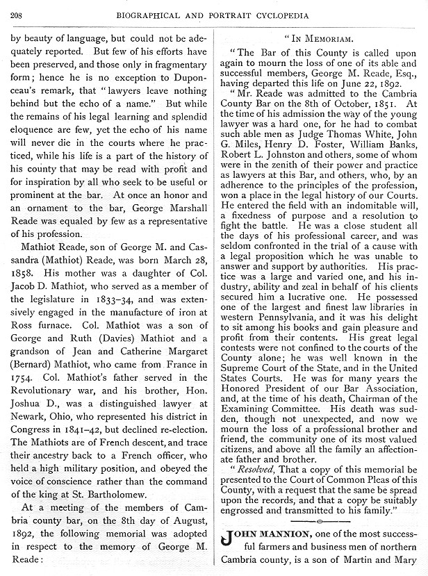 by beauty of language, but could not be adequately reported. But few of his efforts have been preserved, and those only in fragmentary form; hence he is no exception to Duponceau's remark, that “lawyers leave nothing behind but the echo of a name.” But while the remains of his legal learning and splendid eloquence are few, yet the echo of his name will never die in the courts where he practiced, while his life is a part of the history of his country that may be read with profit and for inspiration by all who seek to be useful or prominent at the bar. At once an honor and an ornament to the bar, George Marshall Reade was equaled by few as a representative of his profession. Mathiot Reade, son of George M. and Casandra (Mathiot) Reade, was born March 28, 1858. His mother was a daughter of Col. Jacob D. Mathiot, who served as a member of the legislature in 1833-34, and was extensively engaged in the manufacture of iron at Ross furnace. Col. Mathiot was a son of George and Ruth (Davies) Mathiot and a grandson of Jean and Catherine Margaret (Bernard) Bathiot, who came from France in 1754. Col. Mathiot's father served in the Revolutionary war, and his brother, Hon. Joshua D., was a distinguished lawyer at Newark, Ohio, who represented his district in Congress in 1841-42, but declined re-election. The Mathiots are of French descent, and trace their ancestry back to a French officer, who held a high military position, and obeyed the voice of conscience rather than command of the king at St. Bartholomew. At a meeting of the members of Cambria county bar, on the 8th day of August, 1892, the following memorial was adopted in respect to the memory of George M. Reade: |