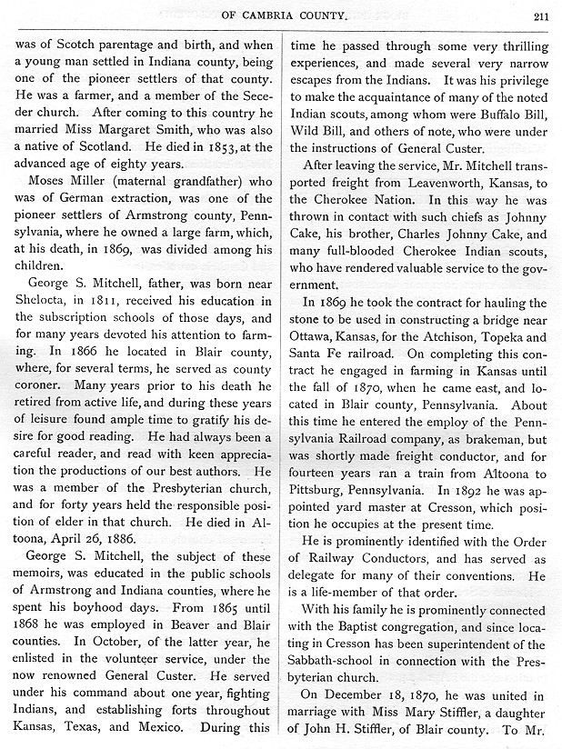 time he passed through some very thrilling experiences, and made several very narrow escapes from the Indians. It was his privilege to make the acquaintance of many of the noted Indian scouts, among whom were Buffalo Bill, Wild Bill, and others of note, who were under the instructions of General Custer. After leaving the service, Mr. Mitchell transported freight from Leavenworth, Kansas to the Cherokee Nation. In this way he was thrown in contact with such chiefs as Johnny Cake, his brother, Charles Johnny Cake, and many full-blooded Cherokee Indian scouts, who have rendered valuable service to the government. In 1869 he took the contract for hauling the stone to be used in constructing a bridge near Ottawa, Kansas, for the Atchison, Topeka and Santa Fe railroad. On completing this contract he engaged in farming in Kansas until the fall of 1870, when he came east, and located in Blair county, Pennsylvania. About this time he entered the employ of the Pennsylvania Railroad company, as brakeman, but was shortly made freight conductor, and for fourteen years ran a train from Altoona to Pittsburg, Pennsylvania. In 1892 he was appointed yard master at Cresson, which position he occupies at the present time. He is prominently identified with the Order of Railway Conductors, and has served as delegate for many of their conventions. He is a life-member of that order. With his family he is prominently connected with the Baptist congregation, and since locating in Cresson has been superintendent of the Sabbath-school in connection with the Presbyterian church. On December 18, 1870, he was united in marriage with Miss Mary Stiffler, a daughter of John H. Stiffler, of Blair county. To Mr. |