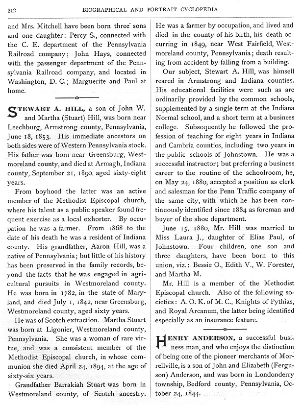 He was a farmer by occupation, and lived and died in the county of his birth, his death occurring in 1849, near West Fairfield, Westmoreland county, Pennsylvania; death resulting from accident by falling from a building. Our subject, Stewart A. Hill, was himself reared in Armstrong and Indiana counties. His educational facilities were such as are ordinarily provided by the common schools, supplemented by a single term at the Indiana Normal school, and a short term at a business college. Subsequently he followed the profession of teaching for eight years in Indiana and Cambria counties, including two years in the public schools of Johnstown. He was a successful instructor; but preferring a business career to the routine of the schoolroom, he, on May 24, 1880, accepted a position as clerk and salesman for the Penn Traffic company of the same city, with which he has been continuously identified since 1884 as foreman and buyer of the shoe department. June 15, 1880, Mr. Hill was married to Miss Laura J., daughter of Elias Paul, of Johnstown. Four children, one son and three daughters, have been born to this union, viz.: Bessie O., Edith V., W. Forester, and Martha M. Mr. Hill is a member of the Methodist Episcopal church. Also of the following societies: A.O.K. of M.C., Knights of Pythias, and Royal Arcanum, the latter being identified especially as an insurance feature.
