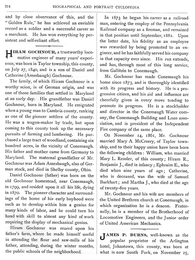 In 1873 he began his career as a railroad man, entering the employ of the Pennsylvania Railroad company as a fireman, and remained in that positian [sic] until September, 1881. Upon the latter date, his fidelity as an employee was rewarded by being promoted to an engineer, and he has faithfully served his company in that capacity ever since. His run extends, and has, through most of this long service, from Gallitzin to Conemaugh. Mr. Gouchnour has made Conemaugh his home since 1873, and is thoroughly identified with its progress and history. He is a progressive citizen, and his aid and influence are cheerfully given in every move tending to promote its progress. He is a stockholder and director in the Conemaugh Water company, the Conemaugh Building and Loan association, and is president of the Independent Fire company of the same place. On November 14, 1861, Mr. Gochnour married Mary A. McCreery, of Taylor township, and to their happy union have been born the following children: William, who married Mary L. Ressler, of this county; Hiram R., Benjamin J., died in infancy; Ephraim E., who died when nine years of age; Catherine, who is deceased, was the wife of Samuel Burkhart; and Martha J., who died at the age of twenty-five years. Mr Gochnour and his wife are members of the United Brethren church at Conemaugh, in which organization he is a deacon. Fraternally, he is a member of the Brotherhood of Locomotive Engineers, and the Junior order of United American Mechanics.