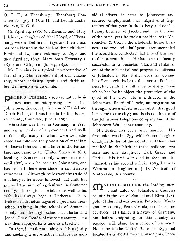 O. O. F., at Ebensburg; Ebensburg Conclave No. 367, I. O. of H., and Beulah Castle, No. 248, K. G. E. On April 14, 1886, Mr. Rivinius and Mary J. Lloyd, a daughter of Abel Lloyd, of Ebensburg, were united in Marriage, and their union has been blessed in the birth of three children: Ferdinand L., born February 2, 1890, and died April 12, 1890; Mary, born February 3, 1891; and Otto, born June 9, 1892. Mr. Rivinius is a typical representative of the sturdy German element of our citizenship, whose industry, genius and thrift are found in every avenue of live.