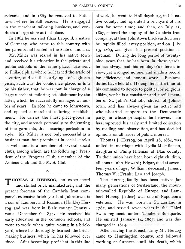 of work, he went to Hollidaysburg, in his native county, and operated a brickyard of his own for some time; and then on July 13, 1867, entered the employ of the Cambria Iron company, at their Johnstown brickyards, where he rapidly filled every position, and on July 13, 1869, was given his present position as foreman. During the long period of twenty-nine years that he has been in these yards, he has always had his employer's interest in view, yet wronged no one, and made a record for efficiency and honest work. Business duties have left Mr. Herzog but little time at his command to devote to political or religious affairs, yet he is a consistent and useful member of St. John's Catholic church of Johnstown, and has always given an active and whole-hearted support to the Democratic party, in whose principles he believes. He has improved his early and limited education by reading and observation, and has decided opinions on all issues of public interest. Thomas J. Herzog, on April 28, 1864, was united in marriage with Lydia M. Hileman, daughter of Philip Hileman, of Blair county. To their union have been born eight children, all sons: John Howard; Edgar, died at seventeen years of age; William, deceased; James; Thomas V.; Frank; Leo and Joseph. The Herzog family has been natives for many generations of Switzerland, the mountain walled Republic of Europe, and Lambert Herzog (father) was one of Napoleon's veterans. He was born in Switzerland in 1787, and served seven years in the Third Swiss regiment, under Napoleon Bonaparte. He enlisted January 14, 1807, and was discharged in 1814. After leaving the French army Mr. Herzog came to Huntingdon county, and followed working at furnaces until his death, which |