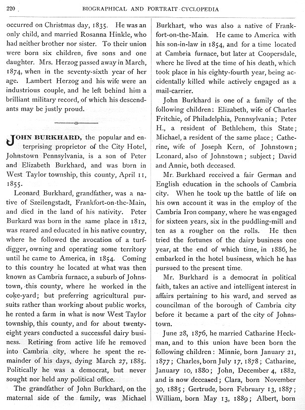 Burkhart, who was also a native of Frankfort-on-the-Main. He came to America with his son-in-law in 1854, and for a time located at Cambria furnace, but later at Coopersdale, where he lived at the time of his death, which took place in his eighty-fourth year, being accidentally killed while actively engaged as a mail-carrier. John Burkhard is one of a family of the following children: Elizabeth, wife of Charles Fritchie, of Philadelphia, Pennsylvania; Peter H., a resident of Bethlehem, this State; Michael, a resident of the same place; Catherine, wife of Joseph Kern, of Johnstown; Leonard, also of Johnstown; subject; David and Annie, both deceased. Mr. Burkhard received a fair German and English education in the schools of Cambria city. When he took up the battle of life on his own account it was in the employ of the Cambria Iron company, where he was engaged for sixteen years, six in the puddling-mill and ten as a rougher on the rolls. He then tried the fortunes of the dairy business one year, at the end of which time, in 1886, he embarked in the hotel business, which he has pursued to the present time. Mr. Burkhard is a democrat in political faith, takes an active and intelligent interest in affairs pertaining to his ward, and served as councilman of the borough of Cambria city before it became a part of the city of Johnstown. June 28, 1886, he married Catharine Heckman, and to this union have been born the following children: Minnie, born January 21, 1877; Charles, born July 17, 1878; Catharine, January 10, 1880; John, December 4, 1882, and is now deceased; Clara, born November 30, 1885; Gertrude, born February 13, 1887; William, born May 13, 1889, Albert, born |