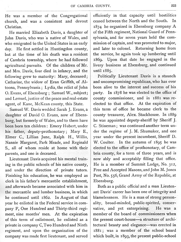 He was a member of the Congregational church, and was a consistent and devout Christian. He married Elizabeth Davis, a daughter of John Davis, who was a native of Wales, and who emigrated to the United States in an early day. He first settled in Huntingdon county , but at the time of his death was a resident of Cambria township, where he had followed agricultural pursuits. Of the children of Mr. and Mrs. Davis, four died in infancy, and the following grew to maturity: Mary, deceased; Catharine, the widow of Evan Griffith, of Altoona, Pennsylvania; Lydia, the relict of John O. Evans, of Ebensburg; Sanuel W., subject; and Lemuel, justice of the peace and real-estate agent, of Kane, McKean county, this State. Samuel W. Davis wedded Sarah J. Evans, a daughter of David O. Evans, now of Ebensburg, but formerly of Wales, and to them have been born ten children: Emery Hubert, under his father, deputy-prothonotary; Mary E., Elmer C., Lillian June, Ralph H., Willis, Nannie Margaret, Park Meade, and Reginald S., all of whom reside at home with their parents, and one is deceased. Lieutenant Davis acquired his mental training in the public schools of his native county, and under the direction of private tutors. Finishing his education, he was employed as clerk in his father's mercantile establishment, and afterwards became associated with him in the mercantile and lumber business, in which he continued until 1862. In August of that year he enlisted in the Federal service in company F, One Hundred and Thirty-third regiment, nine months' men. At the expiration of this term of enlistment, he enlisted as a private in company C, Two Hundred and Ninth regiment, and upon the organization of the company was made first lieutenant, and served |