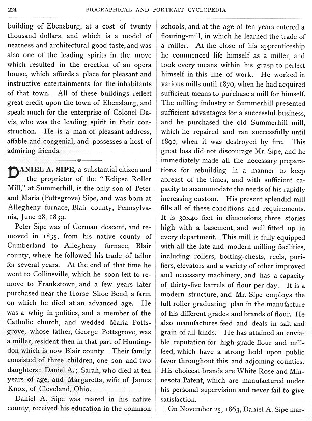 DANIEL A. SIPE, a substantial citizen and the proprietor of the "Eclipse Roller Mill," at Summerhill, is the only son of Peter and Maria (Pottsgrove) Sipe, and was born at Allegheny furnace, Blair county, Pennsylvania, June 28, 1839. |