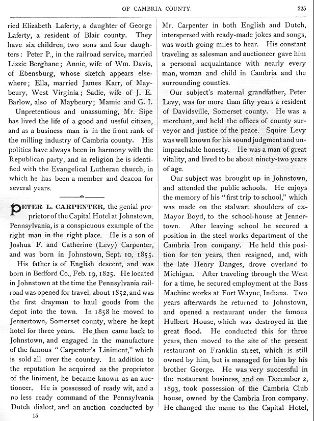 PETER L. CARPENTER, the genial proprietor of the Capital Hotel at Johnstown, Pennsylvania, is a conspicuous example of the right man in the right place. He is a son of Joshua F. and Catherine (Levy) Carpenter, and was born in Johnstown, Sept. 10, 1855. |