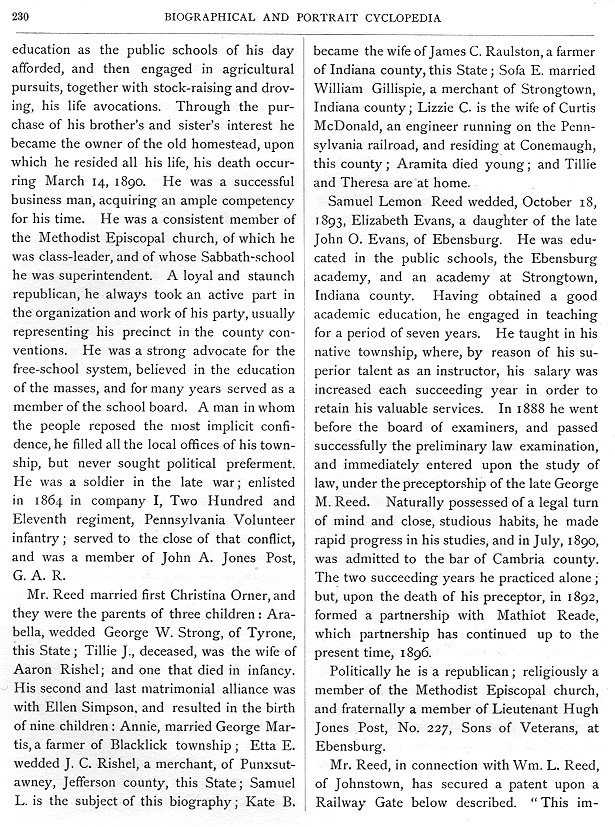education as the public schools of his day afforded, and then engaged in agricultural pursuits, together with stock-raising and droving, his life avocations. Through the purchase of his brother's and sister's interest he became the owner of the old homestead, upon which he resided all his life, his death occurring March 14, 1890. He was a successful business man, acquiring an ample competency for his time. He was a consistent member of the Methodist Episcopal church, of which he was class-leader, and of whose Sabbath-school he was superintendent. A loyal and staunch republican, he always took an active part in the organization and work of his party, usually representing his precinct in the county conventions. He was a strong advocate for the free-school system, believed in the education of the masses, and for many years served as a member of the school board. A man in whom the people reposed the most implicit confidence, he filled all the local offices of his township, but never sought political preferment. He was a soldier in the late war; enlisted in 1864 in company I, Two Hundred and Eleventh regiment, Pennsylvania Volunteer infantry; served to the close of that conflict, and was a member of John A. Jones Post, G. A. R. Mr. Reed married first Christina Orner, and they were the parents of three children: Arabella, wedded George W. Strong, of Tyrone, this State; Tillie J., deceased, was the wife of Aaron Rishel; and one that died in infancy. His second and last matrimonial alliance was with Ellen Simpson and resulted in the birth of nine children: Annie, married George Martis, a farmer of Blacklick township, Etta E., wedded J. C. Rishel, a merchant, of Punxsutawney, Jefferson county, this State; Samuel I., is the subject of this biography; Kate B. |