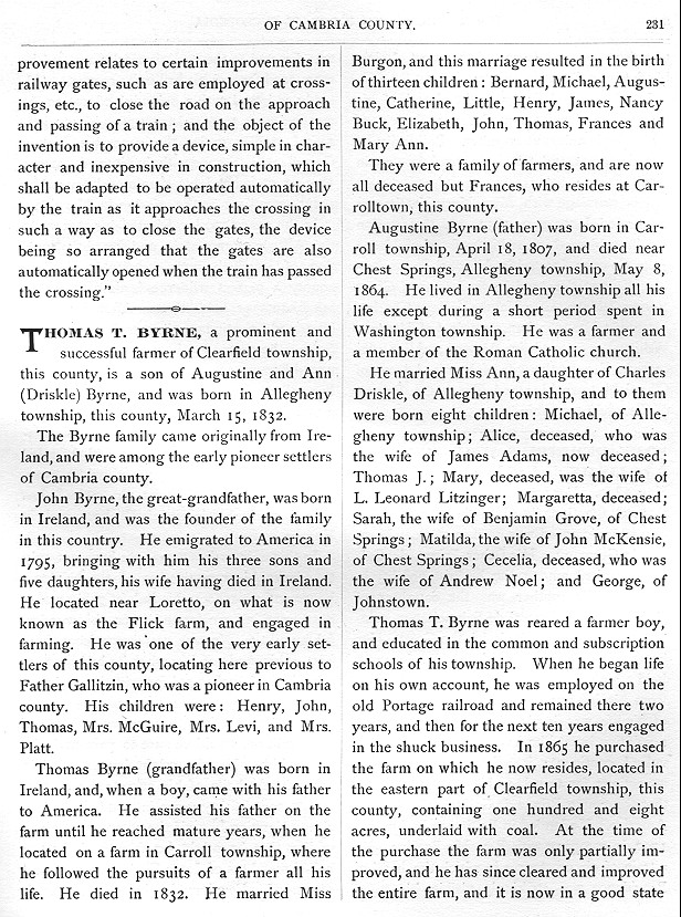 Burgon, and this marriage resulted in the birth of thirteen children: Bernard, Michael, Augustine, Catherine, Little, Henry, James, Nancy Buck, Elizabeth, John, Thomas, Frances and Mary Ann. They were a family of farmers, and are now all deceased but Frances, who resides at Carrolltown, this county. Augustine Byrne (father) was born in Carroll township, April 18, 1807, and died near Chest Springs, Allegheny township, May 8, 1864. He lived in Allegheny township all his life except during a short period spent in Washington township. He was a farmer and a member of the Roman Catholic church. He married Miss Ann, a daughter of Charles Driskle, of Allegheny township, and to them were born eight children: Michael, of Allegheny township; Alice, deceased, who was the wife of James Adams, now deceased; Thomas J.; Mary deceased, was the wife of L. Leonard Litzinger; Margaretta, deceased; Sarah, the wife of Benjamin Grove, of Chest Springs; Matilda, the wife of John McKensie, of Chest Springs; Cecelia, deceased, who was the wife of Andrew Noel; and George, of Johnstown. Thomas T. Byrne was reared a farmer boy, and educated in the common and subscription schools of his township. When he began life on his own account, he was employed on the old Portage railroad and remained there two years, and then for the next ten years engaged in the shuck business. In 1865 he purchased the farm on which he now resides, located in the eastern part of Clearfield township, this county, containing one hundred and eight acres, underlaid with coal. At the time of the purchase the farm was only partially improved, and he has since cleared and improved the entire farm, and it is now in a good state |