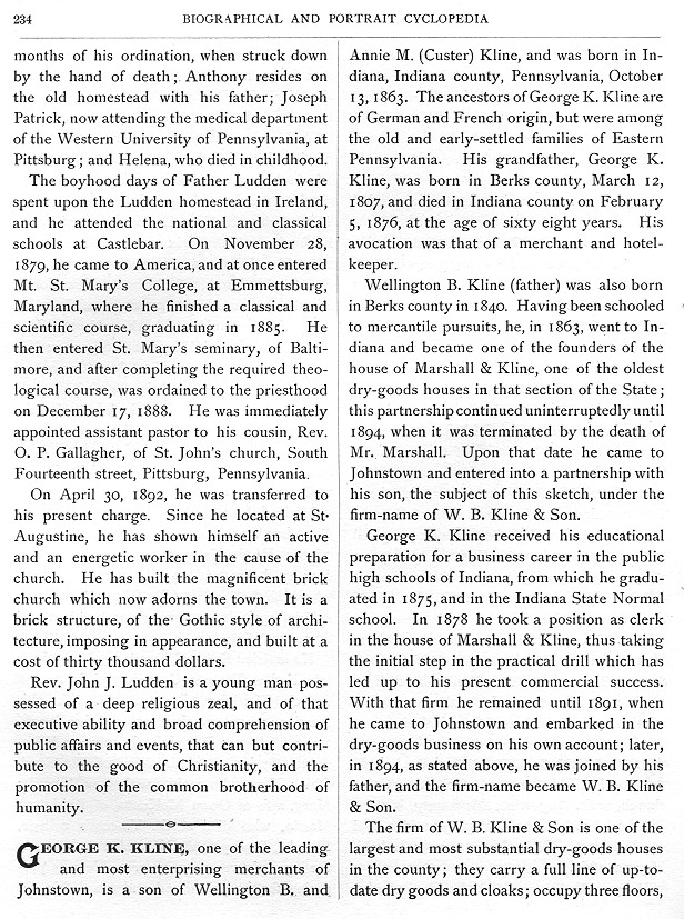 Annie M. (Custer) Kline, and was born in Indiana, Indiana county, Pennsylvania, October 13, 1863. The ancestors of George K. Kline are of German and French origin, but were among the old and early-settled families of Eastern Pennsylvania. His grandfather, George K. Kline, was born in Berks county, March 12, 1807, and died in Indiana county on February 5, 1876, at the age of sixty-eight years. His avocation was that of a merchant and hotelkeeper. Wellington B. Kline (father) was also born in Berks county in 1840. Having been schooled to mercantile pursuits, he, in 1863, went to Indiana and became one of the founders of the house of Marshall & Kline, one of the oldest dry-goods houses in that section of the State; this partnership continued uninterruptedly until 1894, when it was terminated by the death of Mr. Marshall. Upon that date he came to Johnstown and entered into a partnership with his son, the subject of this sketch, under the firm-name of W. B. Kline & Son. George K. Kline received his educational preparation for a business career in the public high schools of Indiana, from which he graduated in 1875, and in the Indiana State Normal school. In 1878 he took a position as clerk in the house of Marshall & Kline, thus taking the initial step in the practical drill which has led up to his present commercial success. With that firm he remained until 1891, when he came to Johnstown and embarked in the dry-goods business on his own account; later, in 1894, as stated above, he was joined by his father, and the firm-name became W. B. Kline & Son. The firm of W. B. Kline & Son is one of the largest and most substantial dry-goods houses in the county, they carry a full line of up-to-date dry goods and cloaks; occupy three floors, |