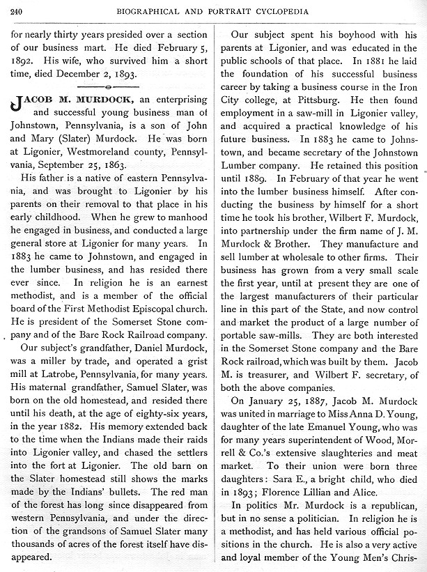 JACOB M. MURDOCK, an enterprising and successful young business man of Johnstown, Pennsylvania, is a son of John and Mary (Slater) Murdock. He was born at Ligonier, Westmoreland county, Pennsylvania, September 25, 1863. |