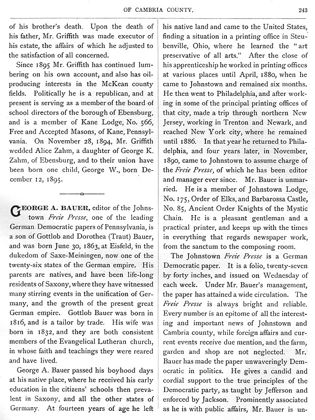 GEORGE A. BAUER, editor of the Johnstown Freie Presse, one of the leading German Democratic papers of Pennsylvania, is a son of Gottlob and Dorothea (Traut) Bauer, and was born June 30, 1863, at Eisfeld, in the dukedom of Saxe-Meiningen, now one of the twenty-six states of the German empire. His parents are natives, and have been life-long residents of Saxony, where they have witnessed many stirring events in the unification of Germany, and the growth of the present great German empire. Gottlob Bauer was born in 1816, and is a tailor by trade. His wife was born in 1832, and they are both consistent members of the Evanelical Lutheran church, in whose faith and teachings they were reared and have lived. |