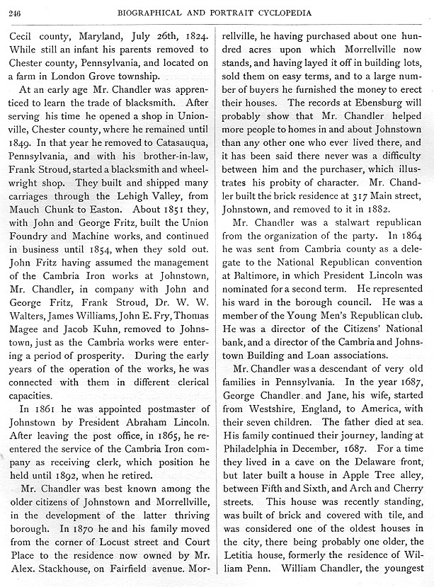 rellville, he having purchased about one hundred acres upon which Morrellville now stands, and having layed it off in building lots, sold them on easy terms, and to a large number of buyers he furnished the money to erect their houses. The records at Ebensburg will probably show that Mr. Chandler helped more people to homes in and about Johnstown than any other one who ever lived there, and it has been said there never was a difficulty between him and the purchaser, which illustrates his probity of character. Mr. Chandler built the brick residence at 317 Main street, Johnstown, and removed to it in 1882. Mr. Chandler was a stalwart republican from the organization of the party. In 1864 he was sent from Cambria county as a delegate to the national Republican convention at Baltimore, in which President Lincoln was nominated for a second term. He represented his ward in the borough council. He was a member of the Young Men's Republican club. He was a director of the Citizens' National bank, and a director of the Cambria and Johnstown Building and Loan associations. Mr. Chandler was a descendant of very old families in Pennsylvania. In the year 1687, George Chandler and Jane, his wife, started from Westshire, England, to America, with their seven children. The father died at sea. His family continued their journey, landing at Philadelphia in December, 1687. For a time they lived in a cave on Delaware front, but later built a house in Apple Tree alley, between Fifth and Sixth, and Arch and Cherry streets. This house was recently standing, was built of brick and covered with tile, and was considered one of the oldest houses in the City, there being probably one older, the Letitia house, formerly the residence of William Penn. William Chandler, the youngest |