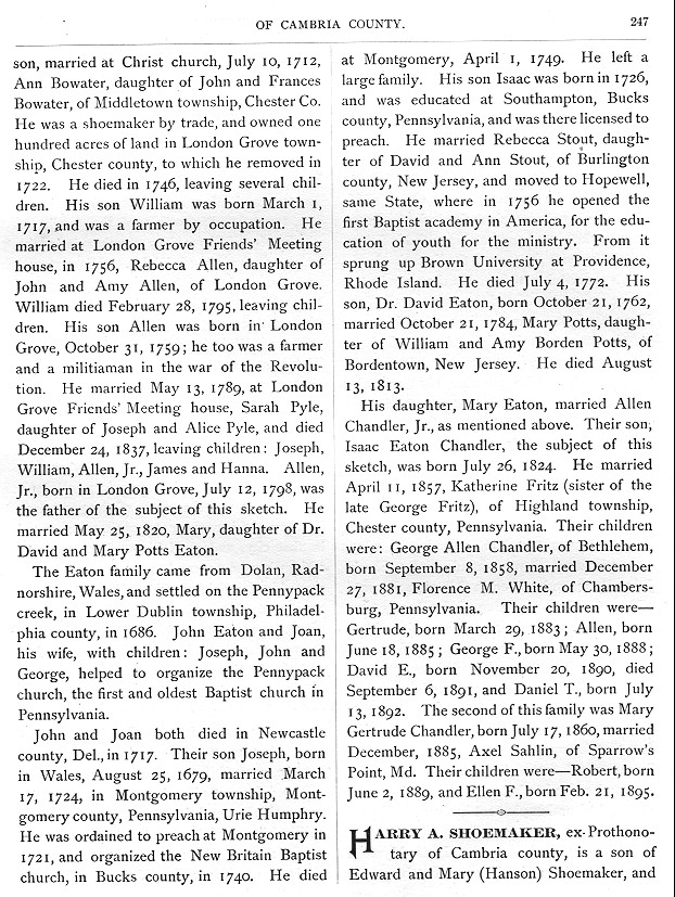 Son, married at Christ church, July 10, 1712, Ann Bowater, daughter of John and Frances Bowater, of Middletown township, Chester Co. He was a shoemaker by trade and owned one hundred acres of land in London Grove township, Chester county, to which he removed in 1722. He died in 1746, leaving several children. His son William was born March 1, 1717, and was a farmer by occupation. He married at London Grove Friends' Meeting house, in 1756, Rebecca Allen, daughter of John and Amy Allen, of London Grove. William died February 28, 1795, leaving children. His son Allen was born in London Grove, October 31, 1759; he too was a farmer and a militiaman in the war of the Revolution. He married May 13, 1789, at London Grove Friends' Meeting house, Sarah Pyle, daughter of Joseph and Alice Pyle, and died December 24, 1837, leaving children: Joseph, William, Allen, Jr., James and Hanna. Allen, Jr., was born in London Grove, July 12, 1798, was the father of the subject of this sketch. He married May 25, 1820, Mary, daughter of Dr. David and Mary Potts Eaton. The Eaton family came from Dolan, Radnorshire, Wales, and settled on the Pennypack creek, in Lower Dublin township, Philadelphia county, in 1686. John Eaton and Joan, his wife, with children: Joseph, John and George, helped to organize the Pennypack church, the first and oldest Baptist church in Pennsylvania. John and Joan both died in Newcastle county, Del., in 1717. Their son Joseph, born in Wales, August 25, 1679, married March 17, 1724, in Montgomery township, Montgomery county, Pennsylvania, Urie Humphry. He was ordained to preach at Montgomery in 1721, and organized the New Britain Baptist church, in Bucks county, in 1740. He died |