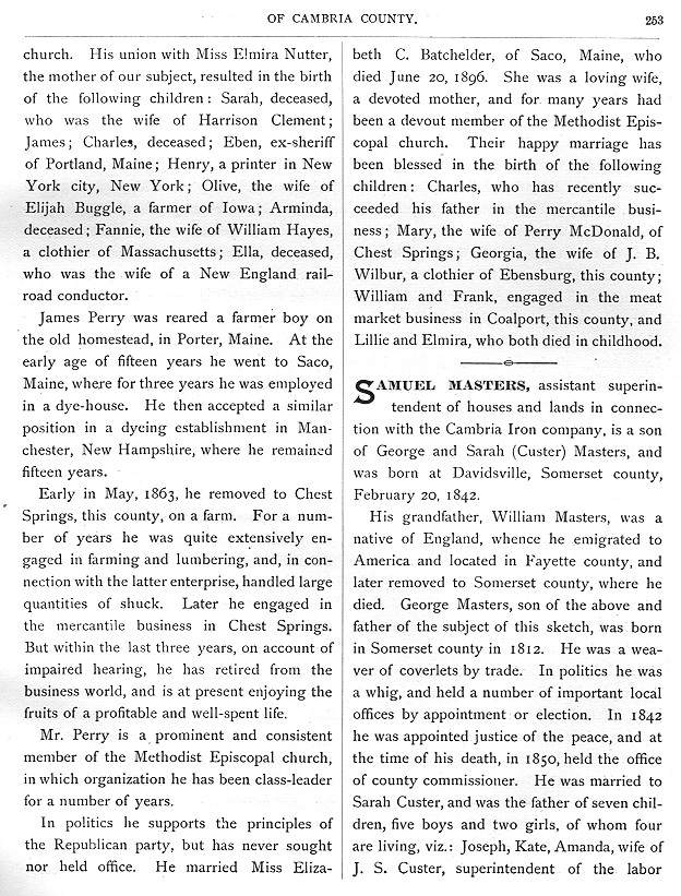 SAMUEL MASTERS, assistant superintendent of houses and lands in connection with the Cambria Iron company, is a son of George and Sarah (Custer) Masters, and was born at Davidsville, Somerset county, February 20, 1842. |