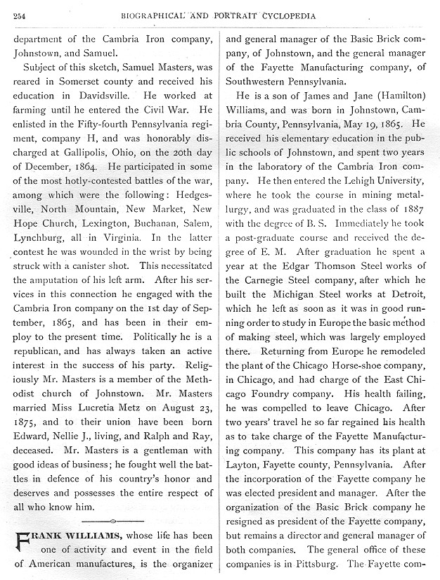 department of the Cambria Iron company, Johnstown, and Samuel. Subject of this sketch, Samuel Masters, was reared in Somerset county and received his education in Davidsville. He worked at farming until he entered the Civil War. He enlisted in the Fifty-fourth Pennsylvania regiment, company H, and was honorably discharged at Gallipolis, Ohio, on the 20th day of December, 1864. He participated in some of the most hotly-contested battles of the war, among which were the following: Hedgesville, North Mountain, New Market, New Hope Church, Lexington, Buchanan, Salem, Lynchburg, all in Virginia. In the latter contest he was wounded in the wrist by being struck with a canister shot. This necessitated the amputation of his left arm. After his services in this conection he engaged with the Cambria Iron company on the 1st day of September, 1865, and has been in their employ to the present time. Politically he is a republican, and has always taken an active interest in the success of his party. Religiously Mr. Masters is a member of the Methodist church of Johnstown. Mr. Masters married Miss Lucretia Metz on August 23, 1875, and to their union have been born Edward, Nellie J., living, and Ralph and Ray, deceased. Mr. Masters is a gentleman with good ideas of business; he fought well the battles in defence [sic] of his country's honor and deserves and possesses the entire respect of all who know him. FRANK WILLIAMS, whose life has been one of activity and event in the field of American manufactures, is the organizer |
