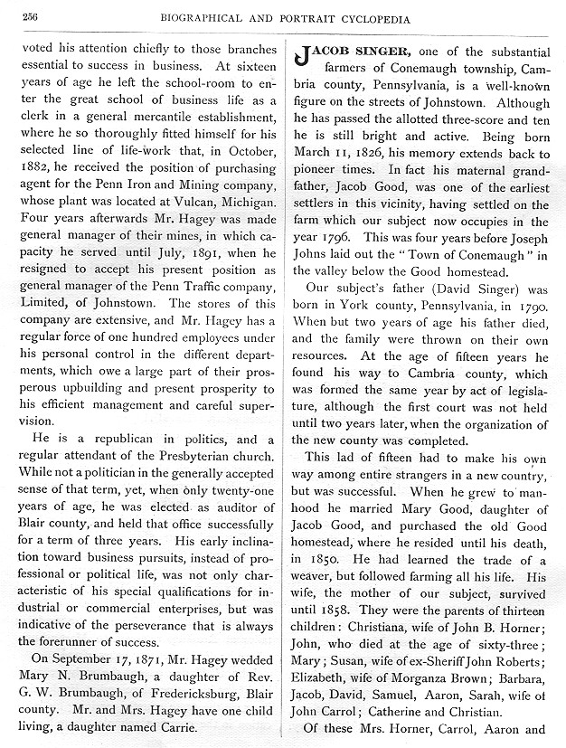 JACOB SINGER, one of the substantial farmers of Conemaugh township, Cambria county, Pennsylvania, is a well-known figure on the streets of Johnstown. Although he has passed the allotted three-score and ten he is still bright and active. Being born March 11, 1826, his memory extends back to pioneer times. In fact his maternal grandfather, Jacob Good, was one of the earliest settlers in this vicinity, having settled on the farm which our subject now occupies in the year 1796. This was four years before Joseph Johns laid out the “Town of Conemaugh” in the valley below the Good homestead. Our subject's father (David Singer) was born in York county, Pennsylvania, in 1790. When but two years of age his father died, and the family were thrown on their own resources. At the age of fifteen years he found his way to Cambria county, which was formed the same year by act of legislature, although the first court was not held until two years later, when the organization of the new county was completed. This lad of fifteen had to make his own way among entire strangers in a new country, but was successful. When he grew to manhood he married Mary Good, daughter of Jacob Good, and purchased the old Good homestead, where he resided until his death in 1850. He had learned the trade of a weaver, but followed farming all his life. His wife, the mother of our subject, survived until 1858. They were the parents of thirteen children: Christiana, wife of John B. Horner; John, who died at the age of sixty-three; Mary; Susan, wife of ex-Sheriff John Roberts; Elizabeth, wife of Morganza Brown; Barbara, Jacob, David, Samuel, Aaron, Sarah, wife of John Carrol; Catherine and Christian. Of these Mrs. Horner, Carrol, Aaron and |