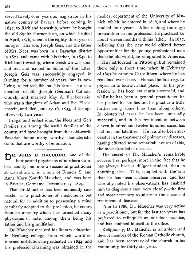 DR. JOHN E. MAUCHER, one of the best posted physicians of northern Cambria county, and now a successful practitioner of Carrolltown, is a son of Francis S. and Anna Mary (Smith) Maucher, and was born in Bavaria, Germany, December 15, 1825. |