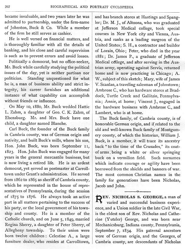 became invaluable, and two years later he was admitted to partnership, under the firm-name of Johnston, Buck & Co. While a member of the firm he still serves as cashier. He is well versed on financial matters, and is thoroughly familiar with all the details of banking, and his close and careful supervision is such as to prevent errors and avoid losses. Politically a democrat, but no office-seeker, Mr. Buck while carefully studying the political issues of the day, yet is neither partisan nor politician. Standing unquestioned for what he is, a man of business ability and strict integrity, his career furnishes an additional instance of what capability can accomplish without friends or influence. On May 10, 1880, Mr. Buck wedded Hattie L. Zahm, a daughter of Geo. C. K. Zahm, of Ebensburg. Mr. and Mrs. Buck have one child, a daughter named Blanche. Carl Buck, the founder of the Buck family in Cambria county, was of German origin and nativity, and built Buck's mills, where his son, Hon. John Buck, was born September 11, 1823. Hon. John Buck was engaged for many years in the general mercantile business, but is now living a retired life. He is an ardent democrat, yet served as postmaster at Carrolltown under Grant's administration. He served from 1862 to 1865 as sheriff Cambria county, which he represented in the house of representatives of Pennsylvania, during the session of 1875 to 1876. He always took an active part in all matters pertaining to the success of his party, or the local government of his township and county. He is a member of the Catholic church, and on June 5, 1849, married Regina Sherry, a daughter of Peter Sherry, of Allegheny township. To their union were born twelve children: Celestine A., a large furniture dealer, who resides at Carrolltown, |
