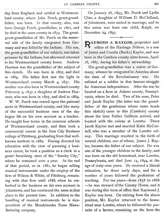 RAYMOND J. KAYLOR, proprietor and editor of the Hastings Tribune, is a son of James and Cecelia (Burke) Kaylor, and was born in the Cambria county alms-house, April 16, 1867, during his father's stewardship. |