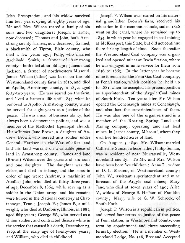 Joseph P. Wilson was reared on his maternal grandfather Brown's farm, received his education in the common schools, and in 1846 went on the canal, where he remained up to 1854, in which year he engaged in coal-mining at McKeesport, this State, but did not continue there for any length of time. Soon thereafter the Westmoreland Coal company was organized and opened mines at Irwin Station, where he was engaged in mine service for them from 1856 to 1863. In the latter year he became mine foreman for the Penn Gas Coal company, at Penn's station, which position he held up to 1881, when he accepted his present position as superintendent of the Argyle Coal mines of South Fork. Ten years later, Mr. Wilson opened the Conemaugh mines at Conemaugh, and also has the superintendence of them. He was also one of the organizers and is a member of the Roaring Spring Land and Mining company, operating zinc and lead mines, in Jasper county, Missouri, where they own five hundred acres of land. On August 5, 1850, Mr. Wilson married Catherine Suman, whose father, Philip Suman, was a resident of near Murraysville, Westmoreland county. To Mr. and Mrs. Wilson have been born five children: Anna L., widow of D. L. Masters, of Westmoreland county; John W., assistant superintendent and mine foreman of the Argyle coal mines; Mary Jane, who died at seven years of age; Alice V., widow of George B. Heffner, of Franklin county; Mary, wife of G. W. Schrock, of South Fork. Joseph P. Wilson is a republican in politics, and served four terms as justice of the peace at Penn station, in Westmoreland county, one term by appointment and three succeeding terms by election. He is a member of Westmoreland Lodge, No. 518, Free and Accepted |