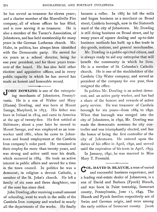 became a roller. In 1885 he left the mills and began business as a merchant on Broad street, Cambria borough, now in the Sixteenth ward of the city of Johnstown. Mr. Dowling is still doing business on Broad street, and by many years of square dealing and up-to-date business methods has built up a fine trade in dry-goods, notions, and general merchandise. Mr. Dowling is a public-spirited citizen, and is always ready to aid any enterprise that will benefit the community in which he lives. He is a member of St. Columba's Catholic church. He is one of the stockholders of the Cambria City Water company, and served as president of the company for one year, then resigned the office. In politics Mr. Dowling is an ardent democrat and an active party worker, and has had a share of the honors and rewards of active party service. He was treasurer of Cambria borough for six years--from 1884 to 1890. When that borough was merged into the city of Johnstown, in 1890, Mr. Dowling was made the democratic nominee for city controller and was triumphantly elected, and has the honor of being the first controller of the city of Johnstown. He entered upon the duties of his office in April, 1890, and served until the expiration of his term in April, 1893. In January, 1891, he was married to Miss Mary T. Fromald.