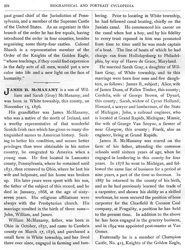 bering. Prior to locating in White township, he had followed canal boating, chiefly on the Juniata canal. He commenced his career on the canal when but a boy, and by his fidelity to every trust reposed in him was promoted from time to time until he was made captain of a boat. The line of boats of which he had charge ran from Hollidaysburg to Philadelphia, by way of Havre de Grace, Maryland. He married Sarah Gray, a daughter of William Gray, of White township, and to this marriage were born four sons and five daughters, as follows: James B., subject; Alice, wife of James Dunn, of Fallen Timber, this county; Cordelia, wife of George Brown, of Dysart, this county; Sarah, widow of Cyrus Holland; Howard, a sawyer and lumberman, of the State of Michigan; John, a railroad engineer, who is located at Grand Rapids, Michigan; Minnie, the wife of George Van Scoyoc, a farmer of near Glasgow, this county; Frank, also an engineer, living at Grand Rapids. James B. McManamy was reared on the farm of his father, attending the common schools until sixteen years of age, when he engaged in lumbering in this county for four years. In 1878 he went to Michigan, and followed the same line of business for a period of nine years, a part of the time as foreman. In 1887 he returned to the county of his birth, and as he had previously learned the trade of a carpenter, and shown his ability as a skilled workman, he soon secured the position of boss carpenter for the Clearfield & Cresson Coal company, at Frugality, a position he has held to the present time. In addition to the above he has been engaged in the grocery business, and in 1894 was appointed post-master at Van Ormer. Fraternally he is a member of Champion Castle, No. 415, Knights of the Golden Eagle, |