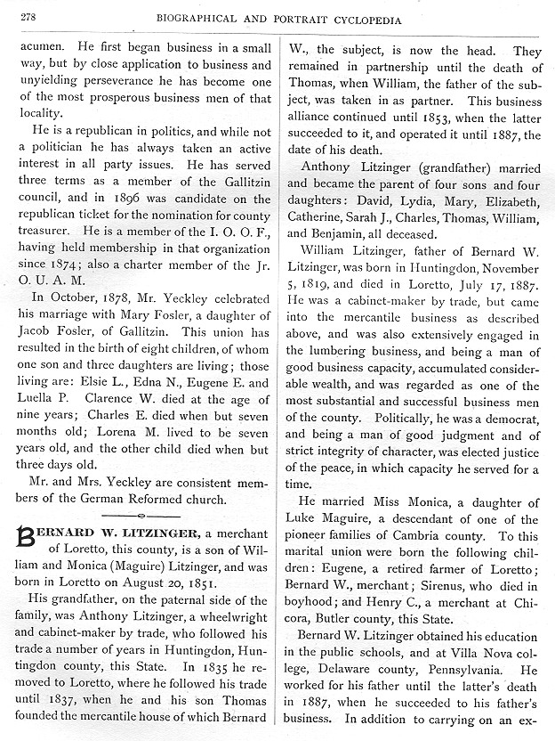 W., the subject, is now the head. They remained in partnership until the death of Thomas, when William, the father of the subject, was taken in as partner. This business alliance continued until 1853, when the latter succeeded to it, and operated it until 1887, the date of his death. Anthony Litzinger (grandfather) married and became the parent of four sons and four daughters: David, Lydia, Mary, Elizabeth, Catherine, Sarah J., Charles, Thomas, William, and Benjamin, all deceased. William Litzinger, father of Bernard W. Litzinger, was born in Huntingdon, November 5, 1819, and died in Loretto, July 17, 1887. He was a cabinet-maker by trade, but came into the mercantile business as described above, and was also extensively engaged in the lumbering business, and being a man of good business capacity, accumulated considerable wealth, and was regarded as one of the most substantial and successful business men of the county. Politically, he was a democrat, and being a man of good judgment and of strict integrity of character, was elected justice of the peace, in which capacity he served for a time. He married Miss Monica, a daughter of Luke Maguire, a descendant of one of the pioneer families of Cambria county. To this marital union were born the following children: Eugene, a retired farmer of Loretto; Bernard W., merchant; Sirenus, who died in boyhood; and Henry C., a merchant at Chicora, Butler county, this State. Bernard W. Litzinger obtained his education in the public schools, and at Villa Nova college, Delaware county, Pennsylvania. He worked for his father until the latter's death in 1887, when he succeeded to his father's business. In addition to carrying on an ex- |
