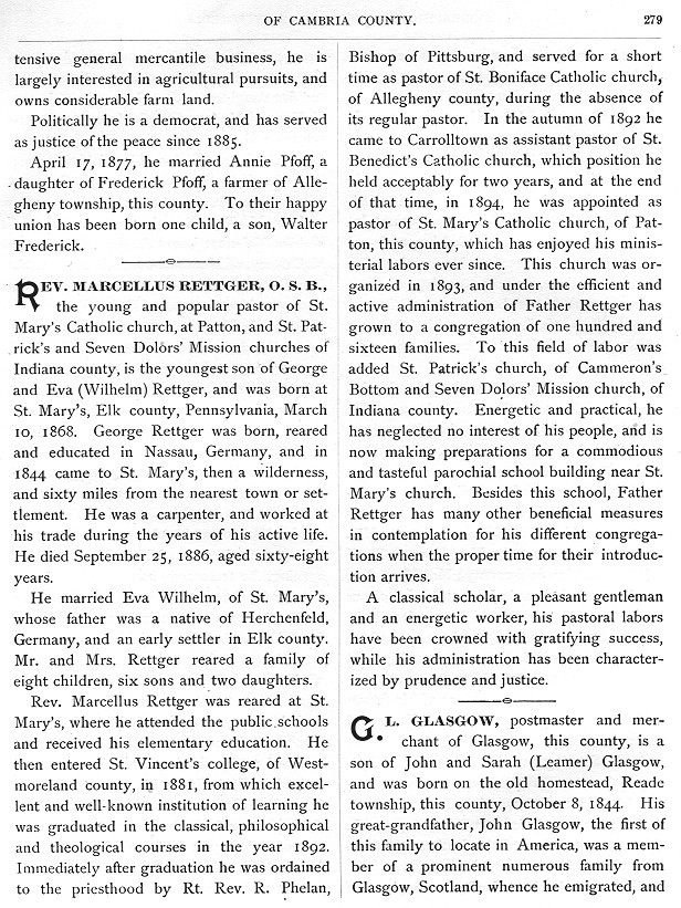 REV. MARCELLUS RETTGER, 0.S.B., the young and popular pastor of St. Mary's Catholic church, at Patton, and St. Patrick's and Seven Dolors' Mission churches of Indiana county, is the youngest son of George and Eva (Wilhelm) Rettger, and was born at St. Mary's, Elk county, Pennsylvania, March 10, 1868. George Rettger was born, reared and educated in Nassau, Germany, and in 1844 came to St. Mary's, then a wilderness, and sixty miles from the nearest town or settlement. He was a carpenter, and worked at his trade during the years of his active life. He died September 25, 1886, aged sixty-eight years. |