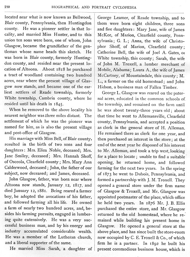 George Leamer, of Reade township, and to them were born eight children, three sons and five daughters: Mary Jane, wife of James McKee, of Marion, Clearfield county, Pennsylvania; G.L.; Anna, the wife of Christopher Shoff, of Marion, Clearfield county; Catherine Bell, the wife of Joel A. Gates, of White township, this county; Sarah, the wife of John M. Troxell, a lumber merchant of Mobile, Alabama; Laura A., the wife of James McCartney, of Mountaindale, this county; M. L., a farmer on the old homestead; and John Hidson, a business man of Fallen Timber. George L. Glasgow was reared on the paternal acres, educated in the common schools of the township, and remained on the farm until he was about twenty-three years old; about that time he went to Allemansville, Clearfield county, Pennsylvania, and accepted a position as clerk in the general store of H. Alleman. He remained there as clerk for one year, and then purchased an interest in the store; at the end of the next year he disposed of his interest to Mr. Alleman, and took a trip west, looking for a place to locate; unable to find a suitable opening, he returned home, and followed farming for the next two years. In the spring of 1873 he went to Dubois, Pennsylvania, and formed a partnership with J. M. Troxell. They opened a general store under the firm name of Glasgow & Troxell, and Mr. Glasgow was appointed postmaster of the place, which office he held two years. In 1876 Mr. J. B. Ellis purchased the entire store, and Mr. Glasgow returned to the old homestead, where he remained while building his present home in Glasgow. He opened a general store at the above place, and has since built the store-room now occupied by C. E. Troxell & Co., of which firm he is a partner. In 1892 he built his present commodious business house, which is |