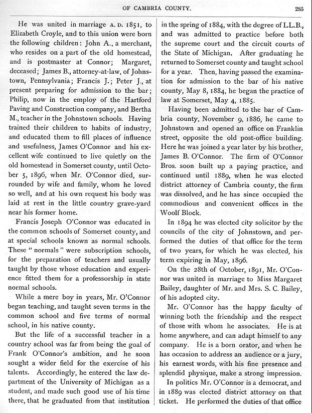 in the spring of 1884, with the degree of LL.B., and was admitted to practice before both the supreme court and the circuit courts of the State of Michigan. After graduating he returned to Somerset county and taught school for a year. Then, having passed the examination for admission to the bar of his native county, May 8, 1884, he began the practice of law at Somerset, May 4, 1885. Having been admitted to the bar of Cambria county, November 9, 1886, he came to Johnstown and opened an office on Franklin street, opposite the old post-office building. Here he was joined a year later by his brother, James B. O'Connor. The firm of O'Connor Bros. soon built up a paying practice, and continued until 1889, when he was elected district attorney of Cambria county, the firm was dissolved, and he has since occupied the commodious and convenient offices in the Woolf Block. In 1894 he was elected city solicitor by the councils of the city of Johnstown, and performed the duties of that office for the term of two years, for which be was elected, his term expiring in May, 1896. On the 28th of October, 1891, Mr. O'Connor was united in marriage to Miss Margaret Bailey, daughter of Mr. and Mrs. S. C. Bailey, of his adopted city. Mr. O'Connor has the happy faculty of winning both the friendship and the respect of those with whom he associates. He is at home anywhere, and can adapt himself to any company. He is a born orator, and when he has occasion to address an audience or a jury, his earnest words, with his fine presence and splendid physique, make a strong impression. In politics Mr. O'Connor is a democrat, and in 1889 was elected district attorney on that ticket. He performed the duties of that office |