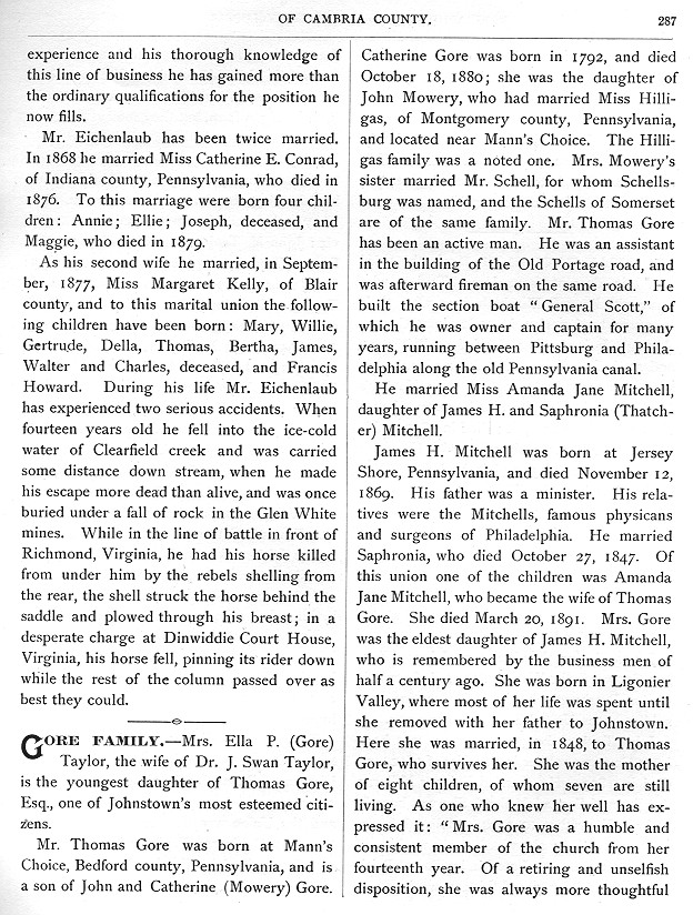 Catherine Gore was born in 1792, and died October 18, 1880; she was the daughter of John Mowery, who had married Miss Hilligas, of Montgomery county, Pennsylvania, and located near Mann's Choice. The Hilligas family was a noted one. Mrs. Mowery's sister married Mr. Schell, for whom Schellsburg was named, and the Schells of Somerset are of the same family. Mr. Thomas Gore has been an active man. He was an assistant in the building of the Old Portage road, and was afterward fireman on the same road. He built the section boat "General Scott," of which he was owner and captain for many years, running between Pittsburg and Philadelphia along the old Pennsylvania canal. He married Miss Amanda Jane Mitchell, daughter of James H. and Saphronia (Thatcher) Mitchell. James H. Mitchell was born at Jersey Shore, Pennsylvania, and died November 12, 1869. His father was a minister. His relatives were the Mitchells, famous physicans and surgeons of Philadelphia. He married Saphronia, who died October 27, 1847. Of this union one of the children was Amanda Jane Mitchell, who became the wife of Thomas Gore. She died March 20, 1891. Mrs. Gore was the eldest daughter of James H. Mitchell, who is remembered by the business men of half a century ago. She was born in Ligonier Valley, where most of her life was spent until she removed with her father to Johnstown. Here she was married, in 1848, to Thomas Gore, who survives her. She was the mother of eight children, of whom seven are still living. As one who knew her well has ex-pressed it: "Mrs. Gore was a humble and consistent member of the church from her fourteenth year. Of a retiring and unselfish disposition, she was always more thoughtful |