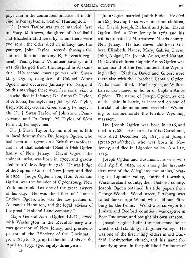 physician in the continuous practice of medicine in Pennsylvania, west of Huntingdon. Dr. James Taylor was twice married, first to Mary Matthews, daughter of Archibald and Elizabeth Matthews, by whome there were two sons; the elder died in infancy, and the younger, John Taylor, served through the late rebellion in company E, Eleventh regiment, Pennsylvania Volunteer cavalry, and was discharged from the hospital in Alexandria. His second marriage was with Susan Mary Ogden, daughter of Colonel Amos Ogden, and occurred January 10, 1849, and by this marriage there were five sons, viz.: a son who died in infancy; Dr. Amos O. Taylor of Altoona, Pennsylvania; Jeffery W. Taylor, Esq., attorney-at-law, Greensburg, Pennsylvania; Dr. J. Swan Taylor, of Johnstown, Pennsylvania, and Dr. Joseph M. Taylor, of West Fairfield, Pennsylvania. Dr. J. Swan Taylor, by this mother is fifth in lineal descent from Dr. Joseph Ogden, who had been a surgeon on a British man-of-war, and is of that celebrated Scotch-Irish Ogden family of New Jersey. David Ogden, the eminent jurist, ws born in 1707, and graduated from Yale college in 1728. He was judge of the Supreme Court of New Jersey, and died in 1800. Judge Ogden's son, Hon. Abraham Ogden, was the founder of Ogdensburg, New York, and ranked as one of the great lawyers of his day. He was the father of Thomas Ludlow Ogden, who was the law partner of Alexander Hamilton, and the legal adviser of the great "Holland Land company." Major-General Aaron Ogden, LLD., served with Washington in the Revolutionary war, was governor of New Jersey, and president-general of the "Society of the Cincinnati," from 1829 to 1839, up to the time of his death, April 19, 1839, aged eighty-three years. |