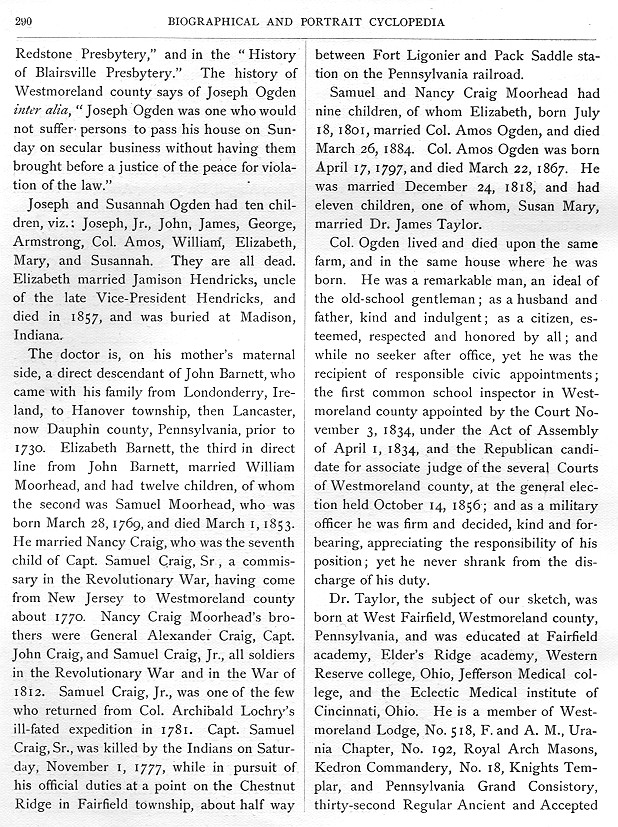 between Fort Ligonier and Pack Saddle station on the Pennsylvania railroad. Samuel and Nancy Craig Moorhead had nine children, of whom Elizabeth, born July 18, 1801, married Col. Amos Ogden, and died March 26, 1884. Col. Amos Ogden was born April 17, 1797, and died March 22, 1867. He was married December 24, 1818, and had eleven children, one of whom, Susan Mary, married Dr. James Taylor. Col. Ogden lived and died upon the same farm, and in the same house where he was born. He was a remarkable man, an ideal of the old-school gentleman; as a husband and father, kind and indulgent; as a citizen, esteemed, respected and honored by all; and while no seeker after office, yet he was the recipient of responsible civic appointments; the first common school inspector in Westmoreland county appointed by the Court November 3, 1834, under the Act of Assembly of April 1, 1834, and the Republican candidate for associate judge of the several Courts of Westmoreland county, at the general election held October 14, 1856; and as a military officer he was firm and decided, kind and forbearing, appreciating the responsibility of his position; yet he never shrank from the discharge of his duty. Dr. Taylor, the subject of our sketch, was born at West Fairfield, Westmoreland county, Pennsylvania, and was educated at Fairfield academy, Elder's Ridge academy, Western Reserve college, Ohio, Jefferson Medical college, and the Eclectic Medical institute of Cincinnati, Ohio. He is a member of Westmoreland Lodge, No. 518, F. and A. M., Urania Chapter, No. 192, Royal Arch Masons, Kedron Commandery, No. 17, Knights Templar, and Pennsylvania Grand Consistory, thirty-second Regular Ancient and Accepted |