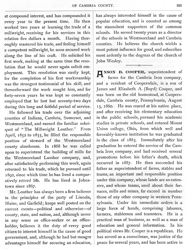 ANSON B. COOPER, superintendent of farms for the Cambria Iron company, and a resident of Coopersdale, is a son of James and Elizabeth A. (Boyd) Cooper, and was born on the old homestead, at Coopersdale, Cambria county, Pennsylvania, August 13, 1860. He was reared at his native place, and after receiving his elementary education in the public schools, pursued his academic studies in private schools, and entered Mount Union college, Ohio, from which well and favorably known instutution he was graduated in the class of 1883. Immediately after his graduation he entered the service of the Cambria Iron company, and had received several promotions before his father's death, which occurred in 1887. He then succeeded his father as superintendent of farms, stables and teams, an important and responsible position under this company, whose lands are so extensive, and whose teams, used about their furnaces, mills and mines, far exceed in number those of any other company in western Pennsylvania. Under his immediate orders is a large force of hands, comprising laborers, farmers, stablemen, and teamsters. He is a practical man of business, as well as a man of education and general information. In his political views Mr. Cooper is a republican. He has seved as a councilman, was justice of the peace for several years, and has been active in |
