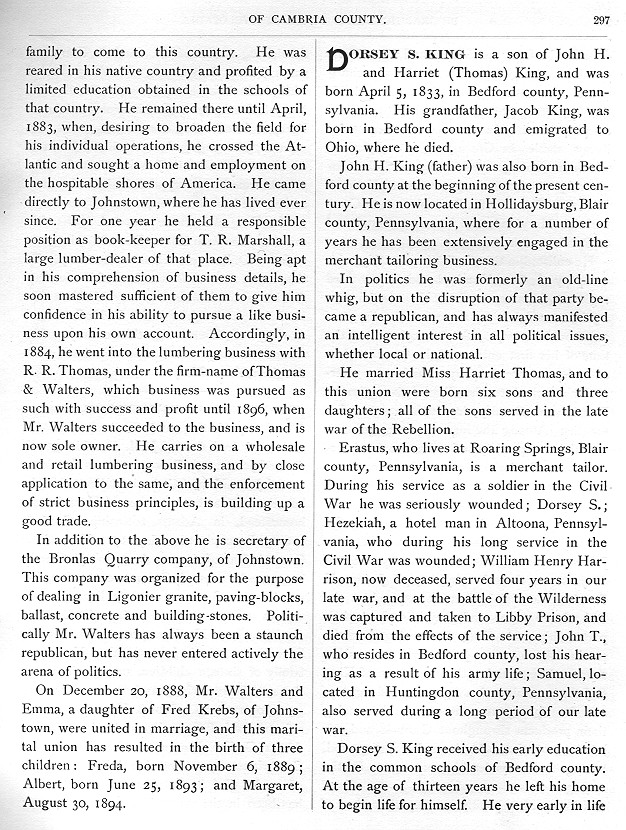 John H. King (father) was also born in Bedford county at the beginning of the present century. He is now located in Hollidaysburg, Blair county, Pennsylvania, where for a number of years he has been extensively engaged in the merchant tailoring business. In politics he was formerly an old-line whig, but on the disruption of that party became a republican, and has always manifested an intelligent interest in all political issues, whether local or national. He married Miss Harriet Thomas, and to this union were born six sons and three daughters, all of the sons served in the late war of the Rebellion. Erastus, who lives at Roaring Springs, Blair county, Pennsylvania, is a merchant tailor. During his service as a soldier in the Civil War he was seriously wounded; Dorsey S.; Hezekiah, a hotel man in Altoona, Pennsylvania, who during his long service in the Civil War was wounded; William Henry Harrison, now deceased, served four years in our late war, and at the battle of the Wilderness was captured and taken to Libby Prison, and died from the effects of the service; John T., who resides in Bedford county, lost his hearing as a result of his army life; Samuel, located in Huntingdon county, Pennsylvania, also served during a long period of our late war. Dorsey S. King received his early education in the common schools of Bedford county. At the age of thirteen years he left his home to begin life for himself. He very early in life |