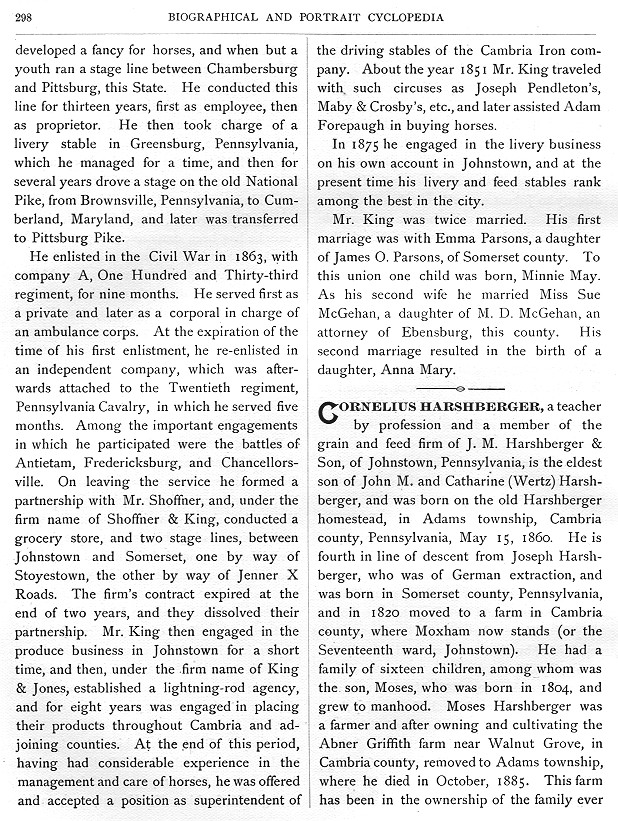 In 1875 he engaged in the livery business on his own account in Johnstown, and at the present time his livery and feed stables rank among the best in the city. Mr. King was twice married. His first marriage was with Emma Parsons, a daughter of James O. Parsons, of Somerset county. To this union one child was born, Minnie May. As his second wife he married Miss Sue McGehan, a daughter of M. D. McGehan, an attorney of Ebensburg, this county. His second marriage resulted in the birth of a daughter, Anna Mary. CORNELIUS HARSHBERGER, a teacher by profession and a member of the grain and feed firm of J. M. Harshberger & Son, of Johnstown, Pennsylvania, is the eldest son of John M. and Catharine (Wertz) Harshberger, and was born on the old Harshberger homestead, in Adams township, Cambria county, Pennsylvania, May 15, 1860. He is fourth in line of descent from Joseph Harshberger, who was of German extraction, and was born in Somerset county, Pennsylvania, and in 1820 moved to a farm in Cambria county, where Moxham now stands (or the Seventeenth ward, Johnstown). He had a family of sixteen children, among whom was the son, Moses, who was born in 1804, and grew to manhood. Moses Harshberger was a farmer and after owning and cultivating the Abner Griffith farm near Walnut Grove, in Cambria county, removed to Adams township, where he died in October, 1885. This farm has been in the ownership of the family ever |